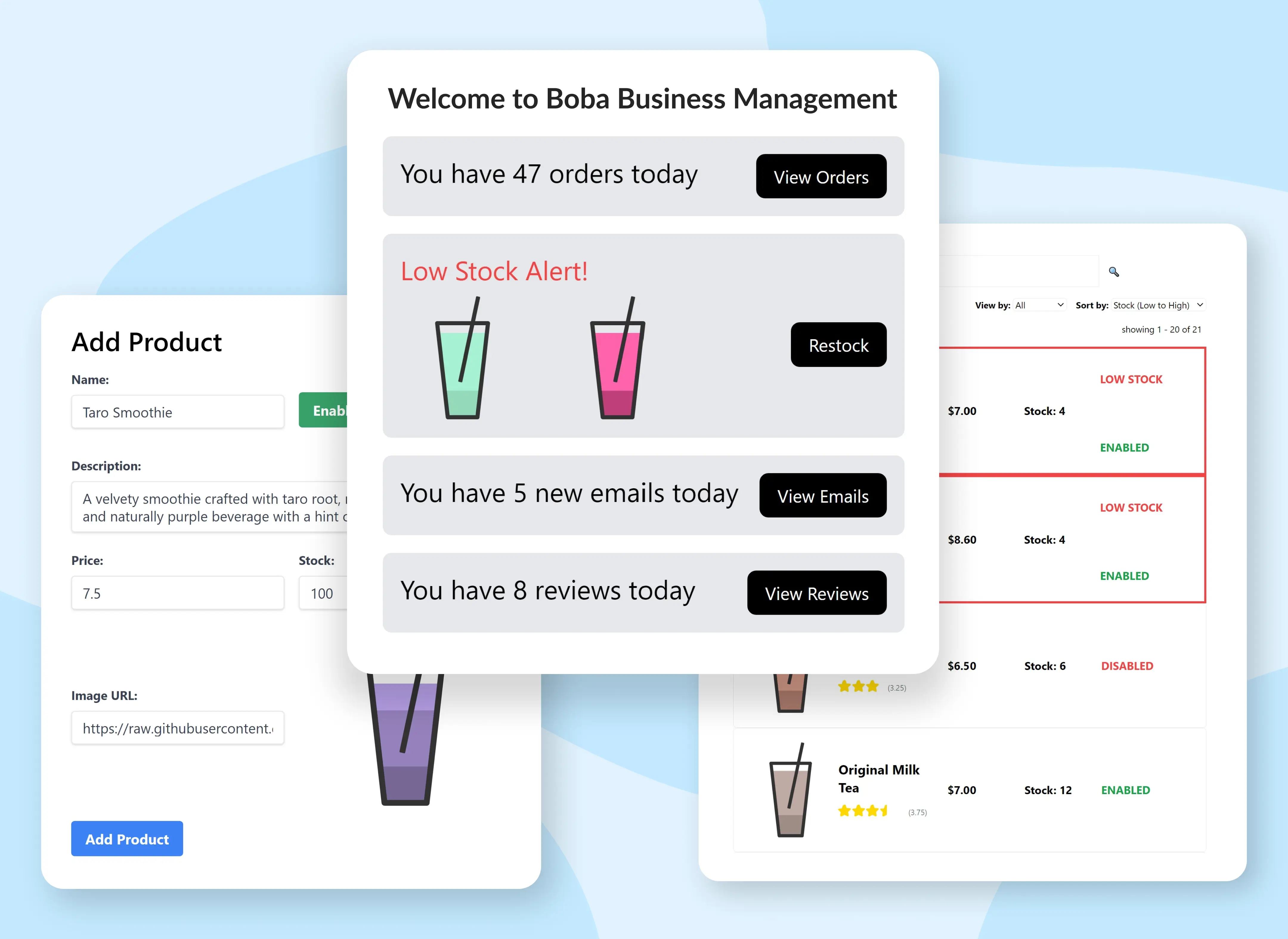 Boba Business Management is both a shopping experience and business management platform, allowing a user to buy and sell products.