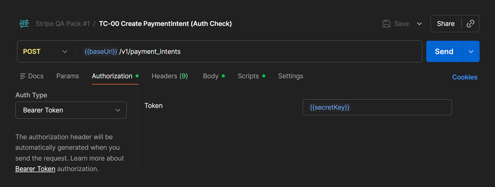 - Auth: Stripe test secret key (Bearer) configured in Postman Auth tab for each request.