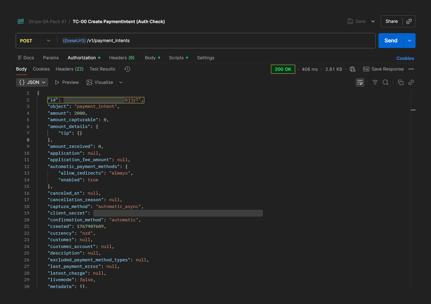 Purpose: Verify that the test secret key is accepted and Stripe returns a valid PaymentIntent (with id and status), proving the environment and Postman setup are working before running any higher-risk scenarios.